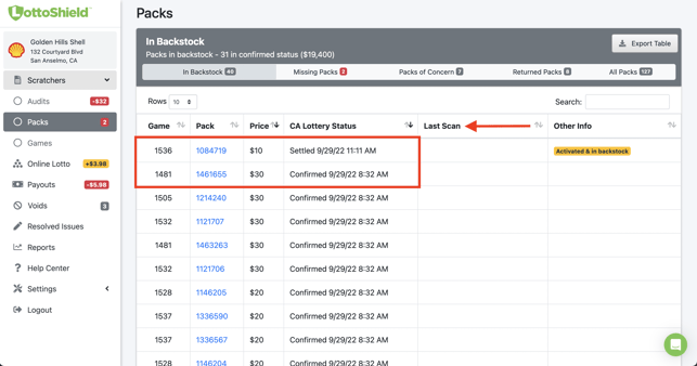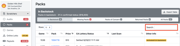 Customers performing backstock audits will see when packs were last scanned in the Last Scan column. Activated packs sitting in backstock should be used before activating new packs of the same game. Settled packs in backstock should be used before activating new packs of the same game or should be set aside for the Lottery rep to return.