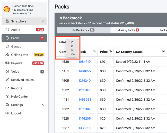 The Packs page will automatically show your backstock. The list shows all of your recorded backstock inventory. You can click on a pack number to see more details such as when the pack was issued and confirmed.
