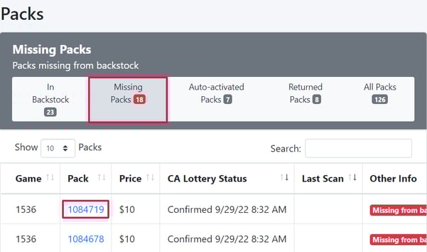 In the menu, click the Missing Packs tab. You’ll see a list of all of the missing packs from your store. You can click the Pack Number to get to the pack details page described earlier.
