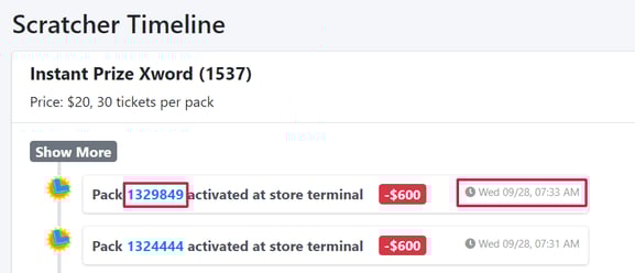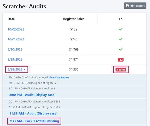 Click the number of missing packs for a location. This opens the Scratcher Audits page. You can adjust how many audits you see by changing the date.