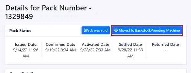 If the pack was moved to backstock or to a vending machine, click Moved to Backstock in the top right. If your store has a vending machine, the button will include a vending machine option.