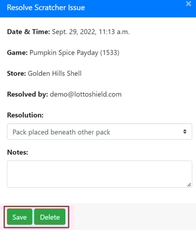 You can either update the resolution and notes by clicking Save or delete the resolution by clicking Delete.